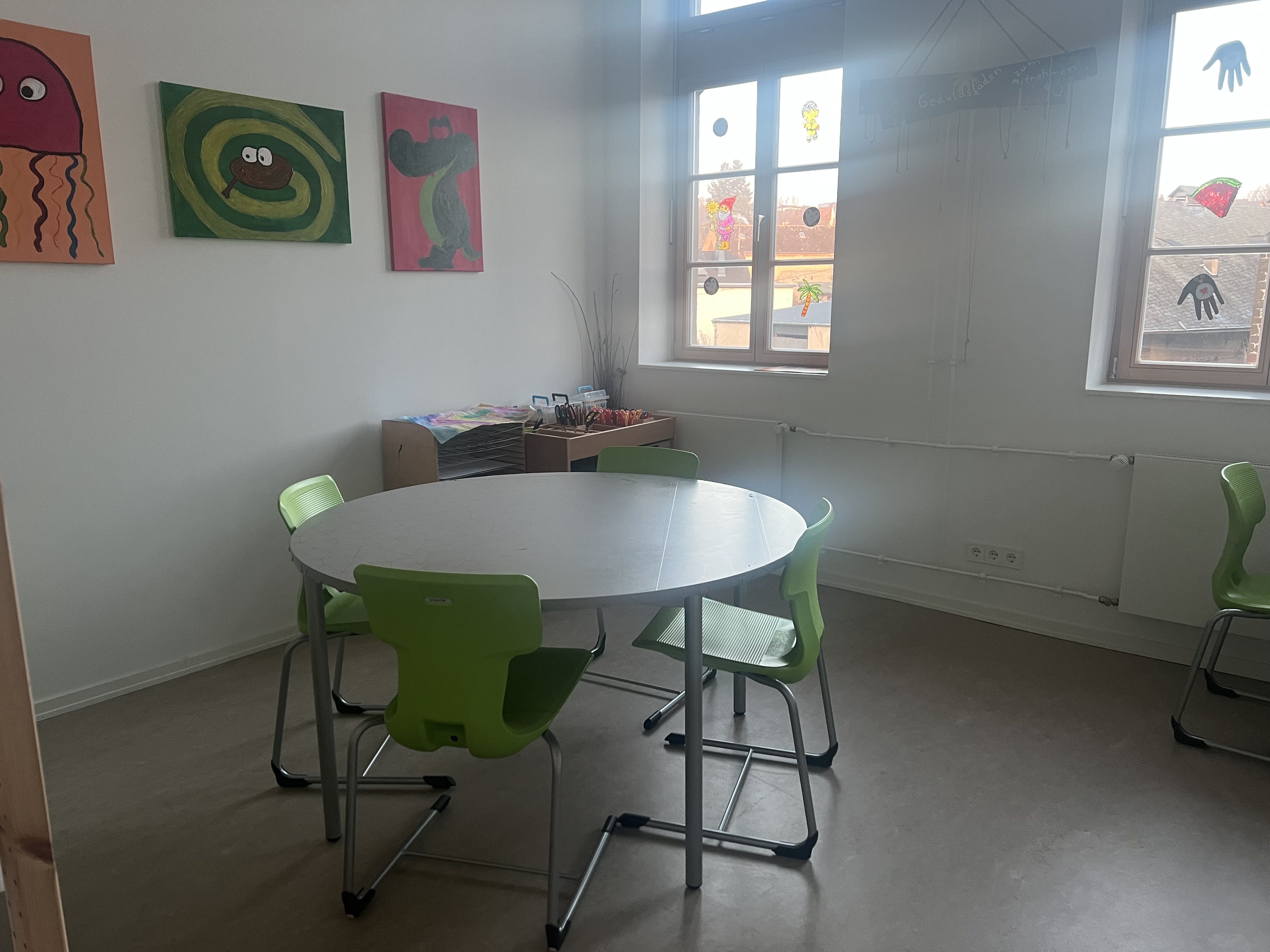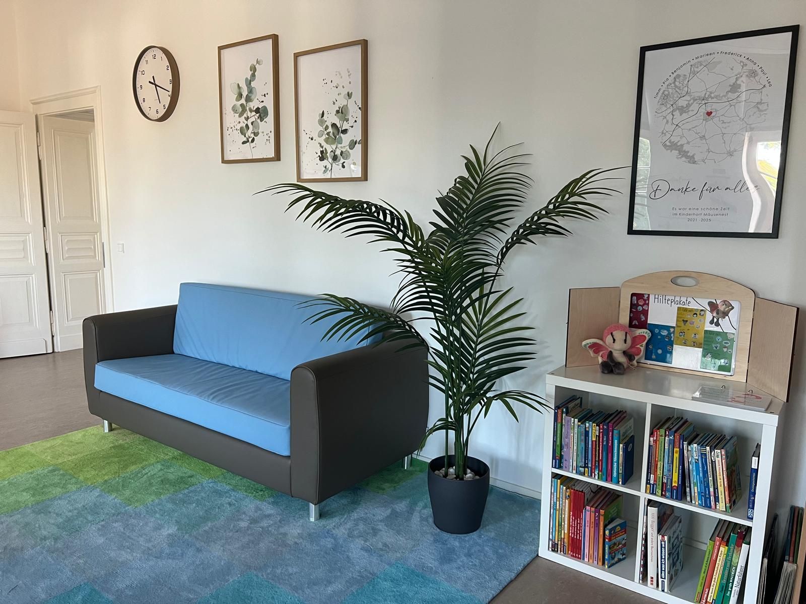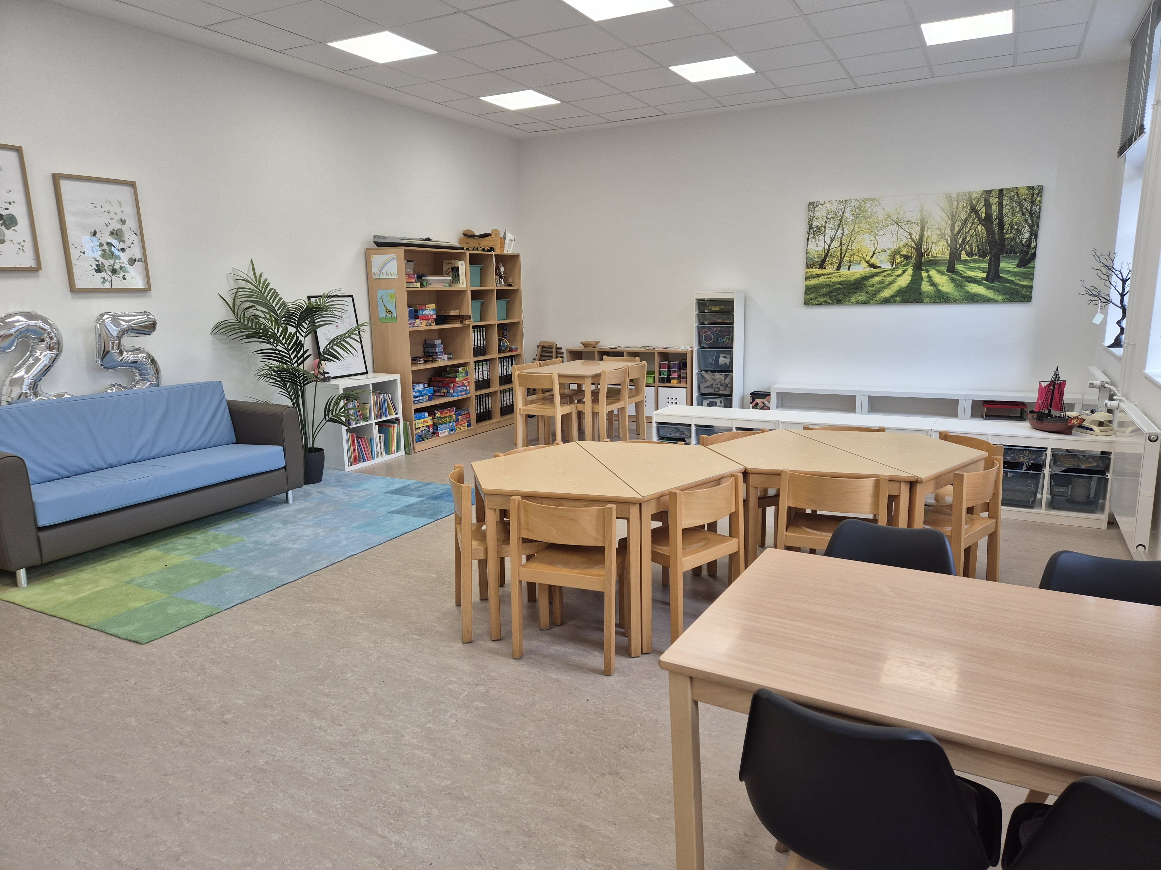 mit Gesellschaftsspielen, Büchern und einer Bügelperlenecke, sowie Platz zum Essen und Trinken.