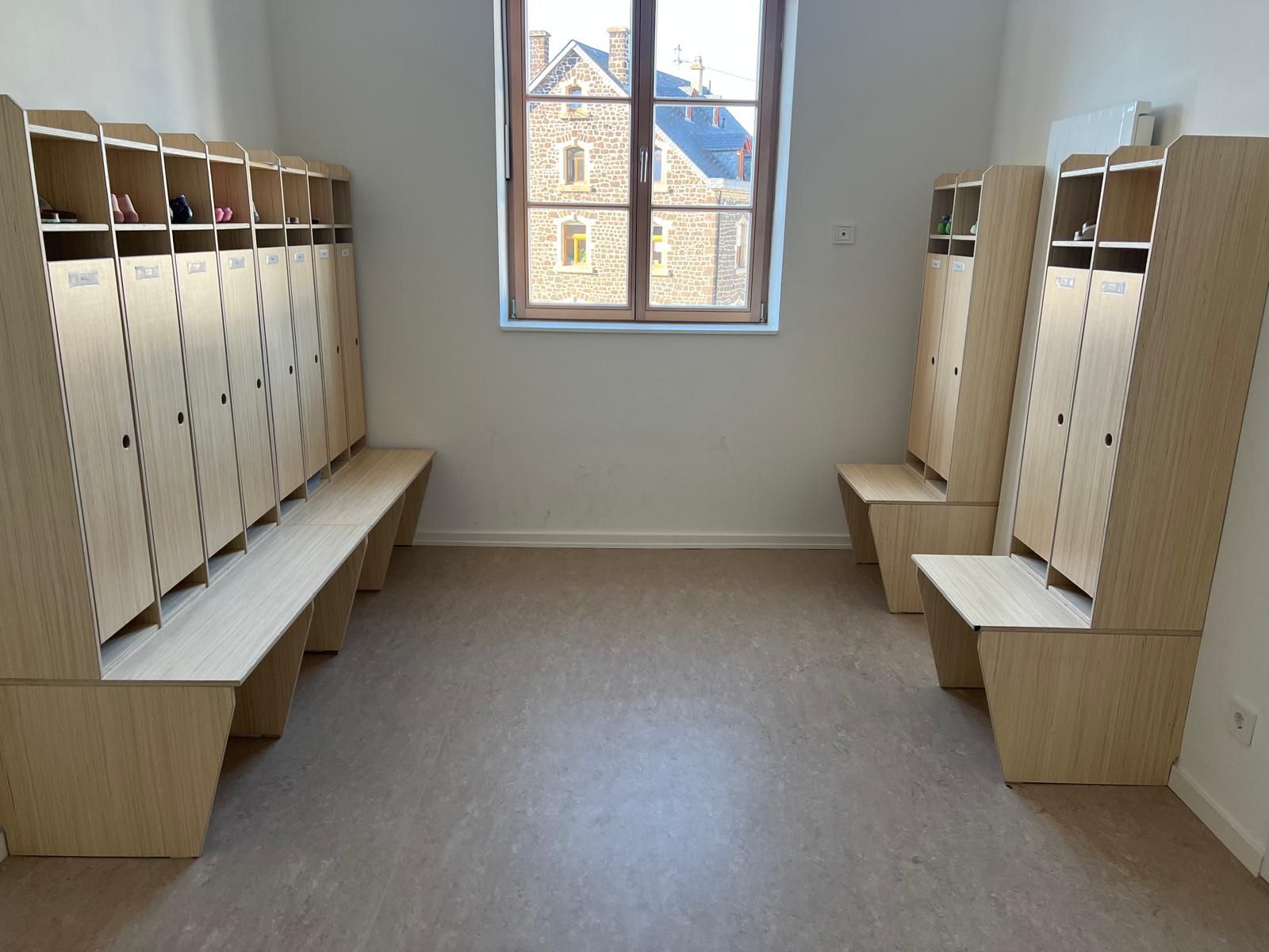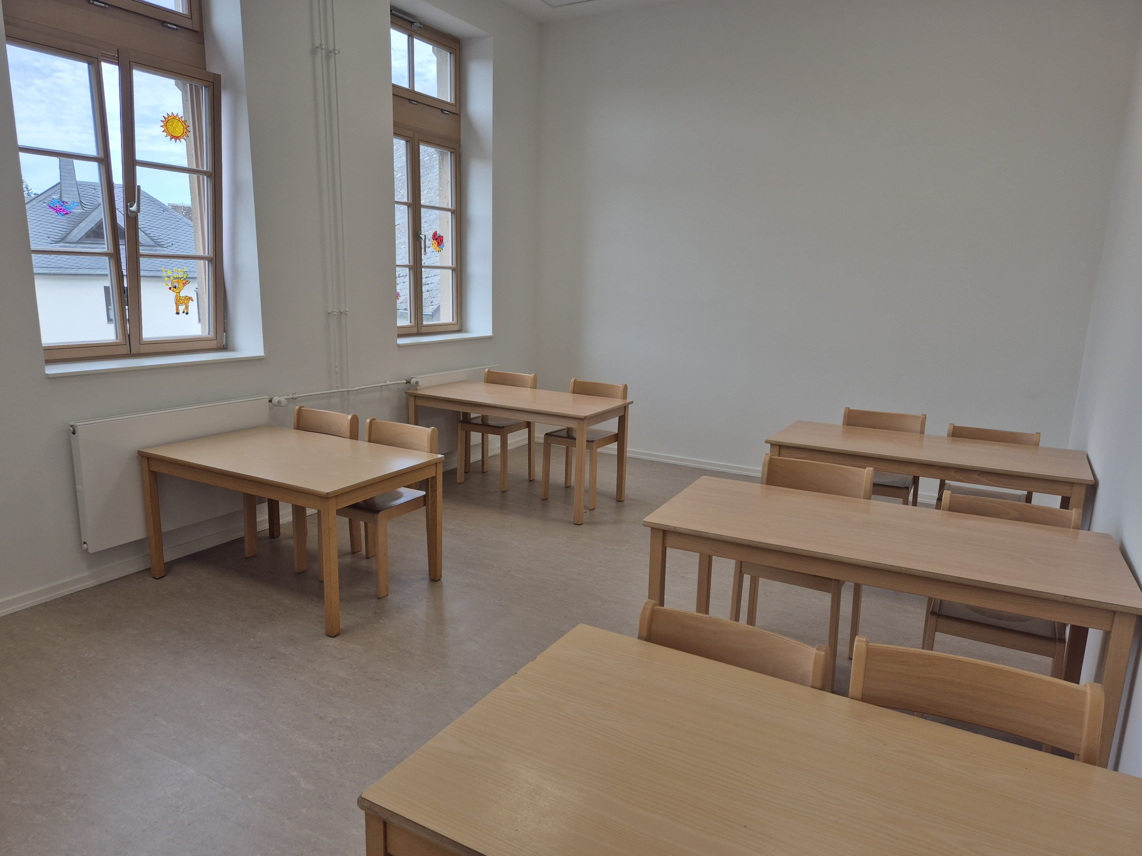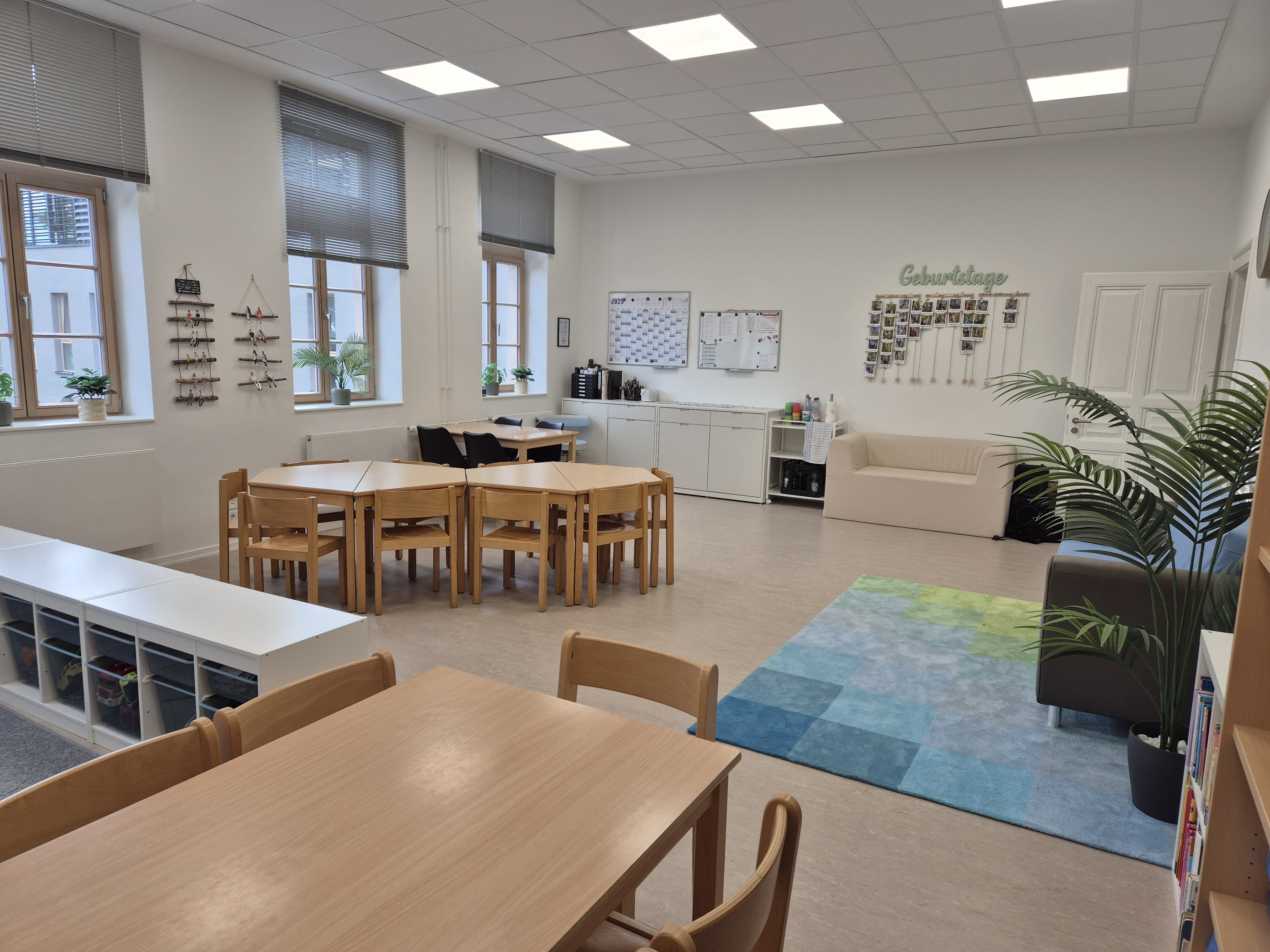 mit Tischen, Stühlen, Matten, Sitzbällen, Hilfeplakaten und jeweils einem Whiteboard.